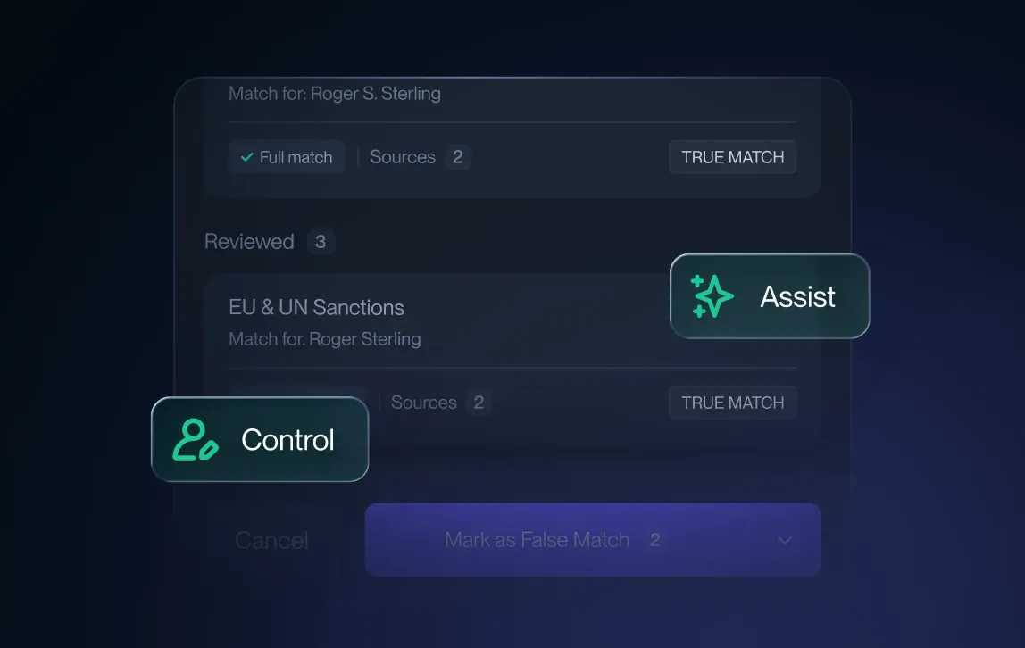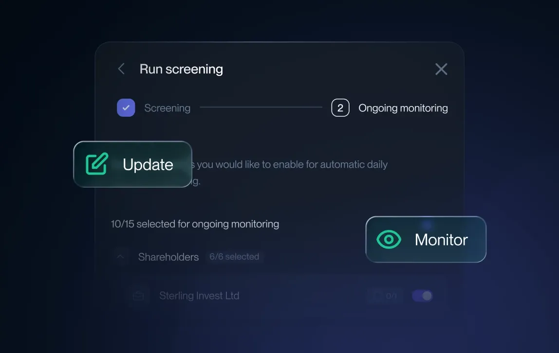 Entities stay screened daily against sanctions, PEP, and adverse media updates.