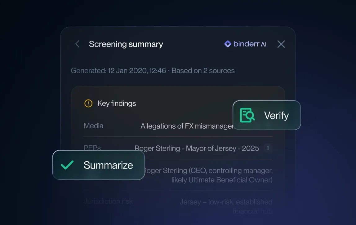 Binderr’s AI Screening processes thousands of checks across entities, ownership structures, and global watchlists — helping teams act faster and stay informed.