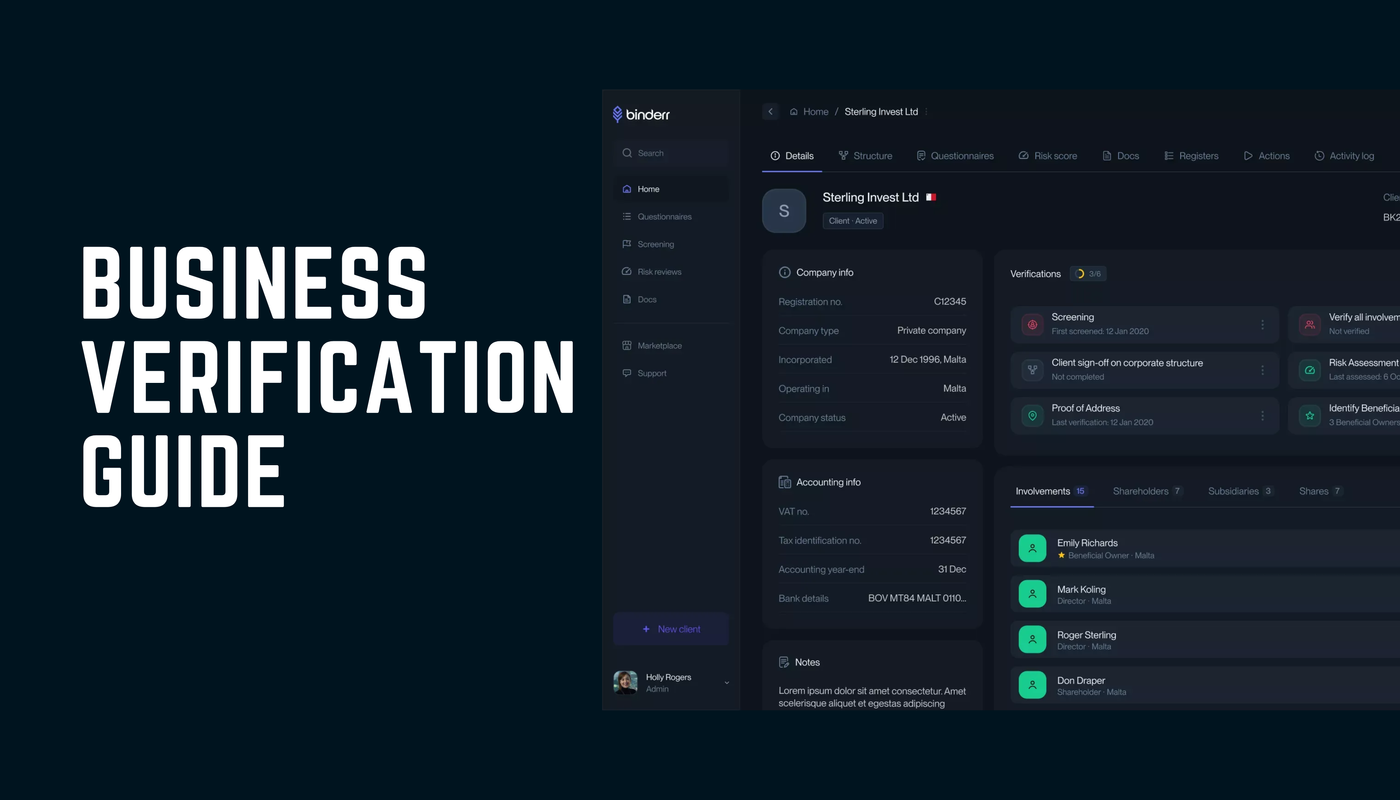 Binderr allows you to check global business registries, identify and verify Ultimate Beneficial Owners (UBOs), validate corporate documents, conduct business address verification, and perform corporate screening with comprehensive risk assessments.